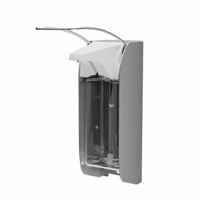 ingo-man® plus IMP TLS A/24, Spender für Flüssigseifen und Desinfektionsmittel, für 1.000 ml Standard-Euroflaschen, langer Bedienhebel, eloxiertes Aluminium, mattsilber, austauschbare 24er Edelstahlpumpe mit gekröpftem Saugrohr, einfacher Pumpenwechsel durch Frontentnahme, einstellbare Dosierung (ca. 0,75/ 1,0/ 1,2/ 1,5 ml/Hub), 1 Clip, inkl. PET-Leerflasche, autoklavierbar, spülmaschinengeeignet