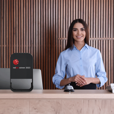 Berührungsloses Händedesinfektionsgerät für alkoholische Händedesinfektionsmittel, für 600 ml, mit X10-Antrieb und Pumpe für Seifen und Desinfektionsmittel, einstellbare Dosiermenge 0,6/1,0/1,4 ml/Hub, nachfüllbarer Behälter, Bedienung von beiden Seiten möglich, Aluminiumrahmen mattschwarz, Tür (Front) aus Edelstahl mit Anti-Fingerprint-Beschichtung, abschließbar, mit CleanTip Technologie (kein Nachtropfen), geeignet als Standgerät auf dem Tisch sowie mit optionalem Zubehör auch für die Säulenmontage, integrierte Auffangschale, Antrieb durch 4x Alkaline D Batterien