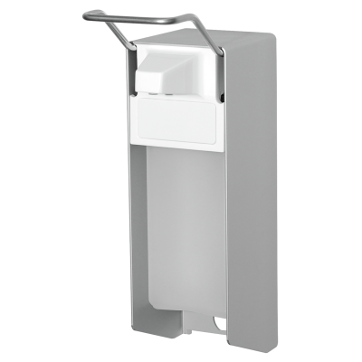 ingo-man® E 26 A/24 soap and disinfectant dispenser, for 500 ml standard Euro bottles, short operating lever, matte-silver anodized aluminium, exchangeable stainless steel pump 24 with bent suction tube, different dosage adjustments (approx. 0.7/ 1.0/ 1.5 ml/stroke), 1 clip, PET Euro bottle incl.