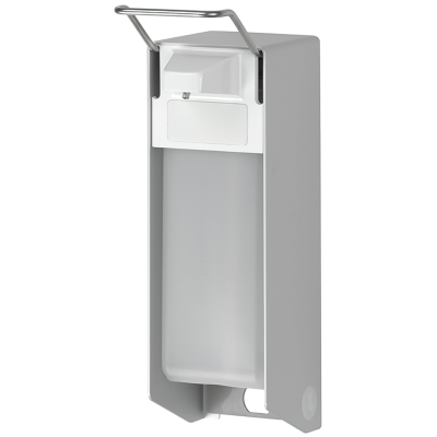 ingo-man® T 26 A/24 soap and disinfectant dispenser, for 1000 ml standard Euro bottles, short operating lever, matte-silver anodized aluminium, exchangeable stainless steel pump 24 with bent suction tube, different dosage adjustments (approx. 0.7/ 1.0/ 1.5 ml/stroke), 1 clip, PET Euro bottle incl.